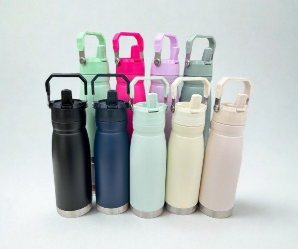 Botella térmica de 800 ml con manija y pico retractil de plástico rígido.
