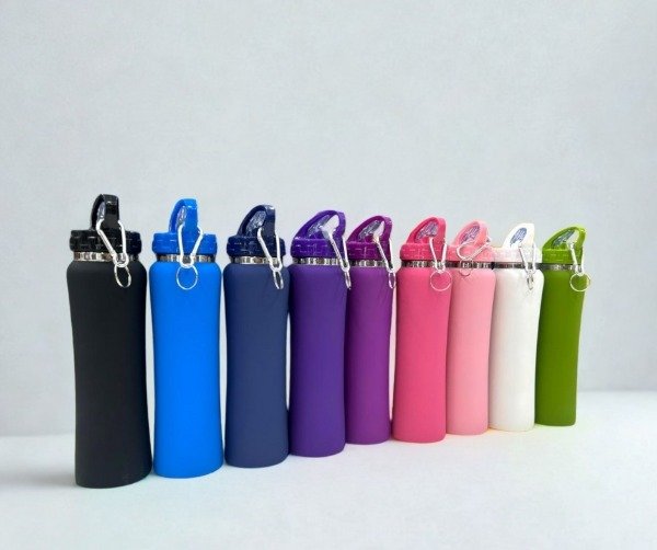 Botella térmica engomada de 750 ml con manija y pico retractil de plástico rígido.